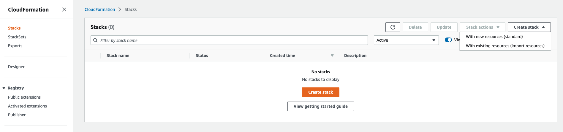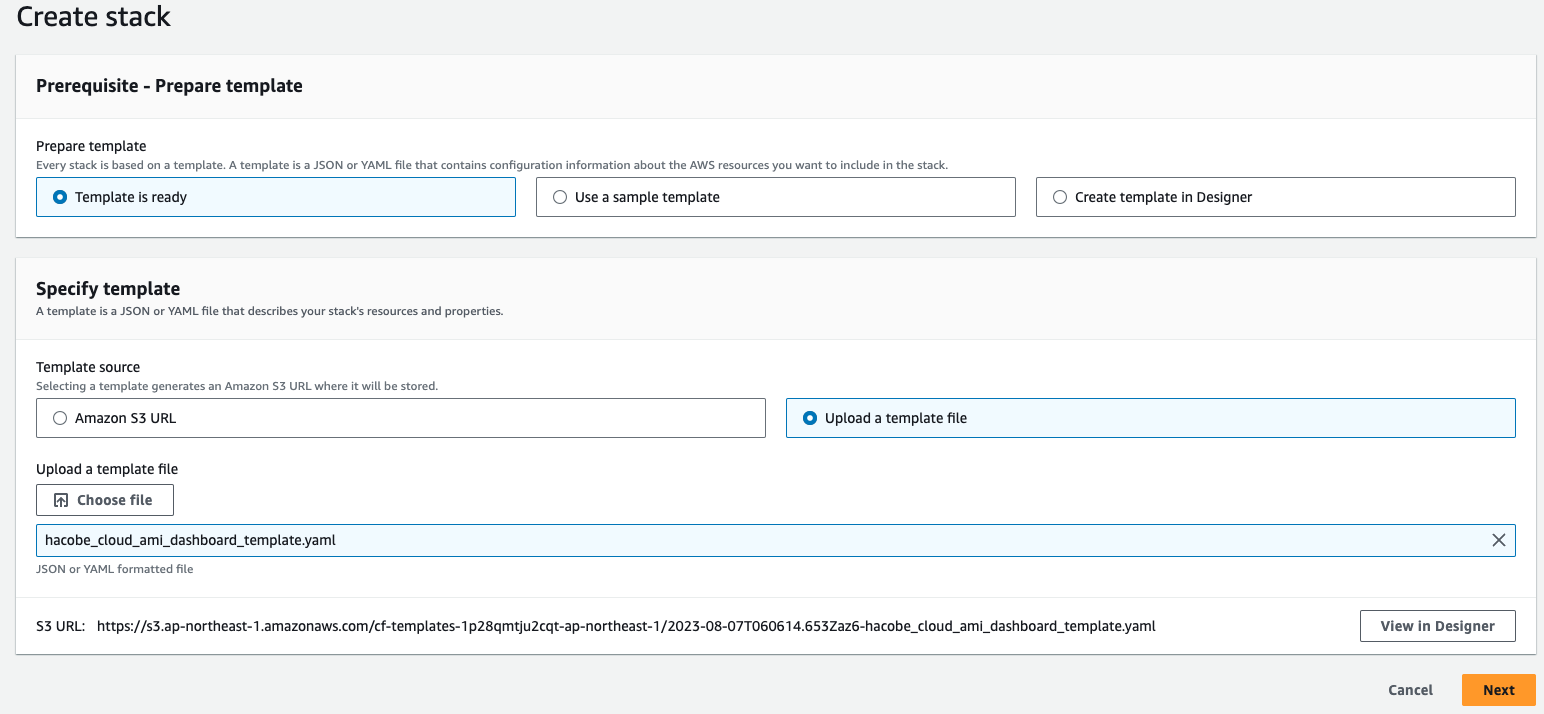 Select Upload a template file and select the provided hacobe_cloud_ami_dashboard_template.yaml from Choose File.