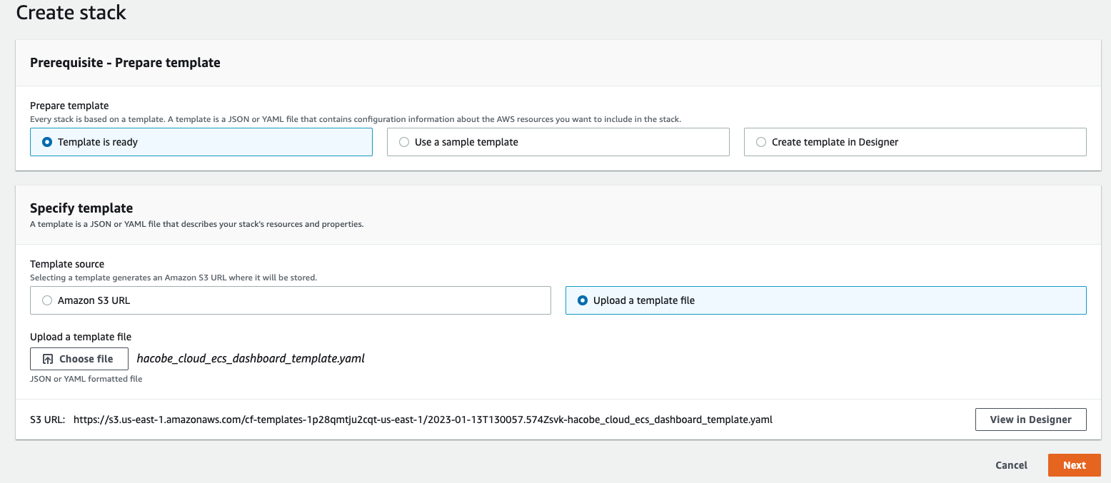 Select Upload a template file and select the provided hacobe_cloud_ecs_dashboard_template.yaml from Choose File.
